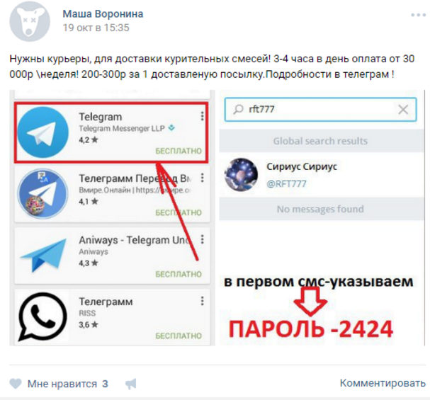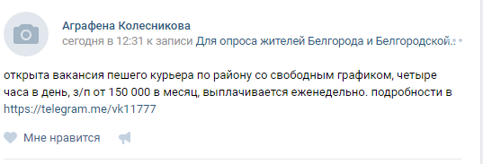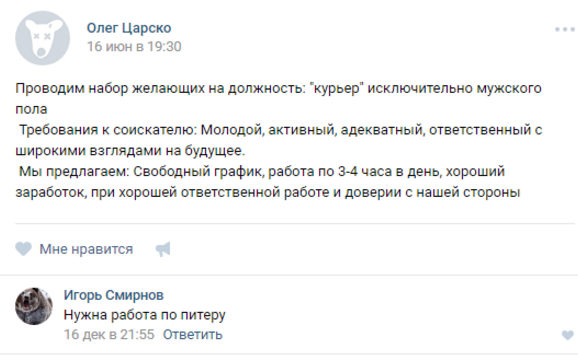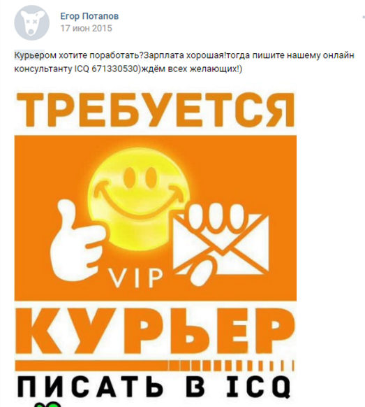 Объявления о работе пешим курьером можно найти на Авито — российский аналог OLX — и в социальных сетях. ВКонтакте есть группы «Работа курьером в России и Украине». Там часто встречаются подобные объявления. В 90% случаев речь идет именно о распространении наркотиков.