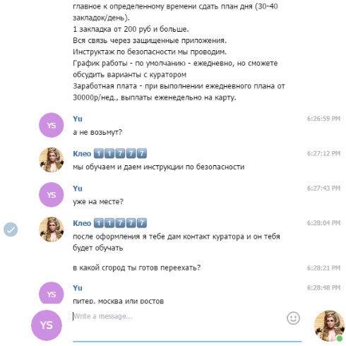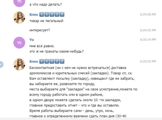 «Бесконтактная (ни с кем не нужно встречаться) доставка аромомиксов и курительных смесей (закладки). Вам оставляют посылку (закладку), извещают, где ее забрать, вы забираете ее, развозите по городу, места выбираете для „закладок“ на свое усмотрение, можете по всему городу работать или в одном районе. В одном дворе можете сделать около 10-ти закладок, главное предоставить отчет — что и где вы оставили. Время работы выбираете сами — день, утро, ночь, главное к определенному времени сдать план дня (30−40 закладок/день)», — описал вербовщик условия работы. За одну «закладку» платят от 200 руб., то есть в день ты зарабатываешь около 2500 грн. Выплаты обещают еженедельно на карту.