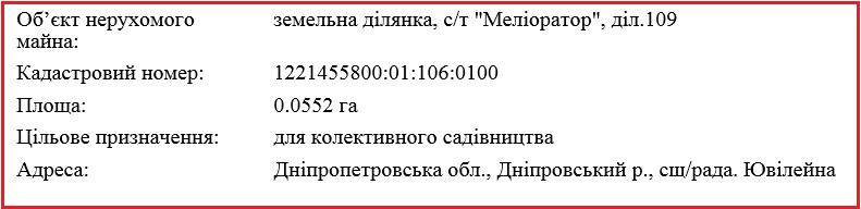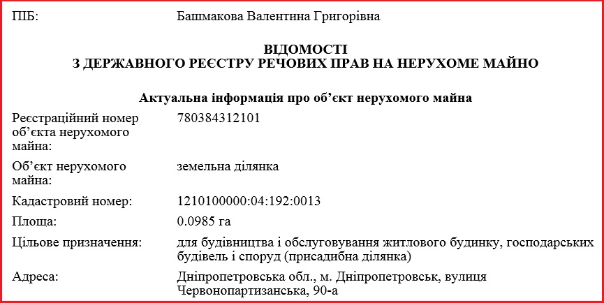 У власності ж матері, Валентини Григорівни, є будинок у Дніпрі по вул. Червонопартизанська та земельна ділянка для садівництва в сщ/раді Ювілейній.