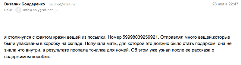 В середине ноября, сотрудников 23го отделения "Новой Пошты" что находится в городе Киев на Проспекте Бажана, задержала киевская полиция. Парни попались "на горячем". С этого момента уже прошел месяц, однако "Нова Пошта" не отвечает на наши официальные письма с просьбой разъяснить ситуацию, как долго будут длиться кражи посылок, и каким образом компания собирается пресечь это? А собирается ли вообще ?!