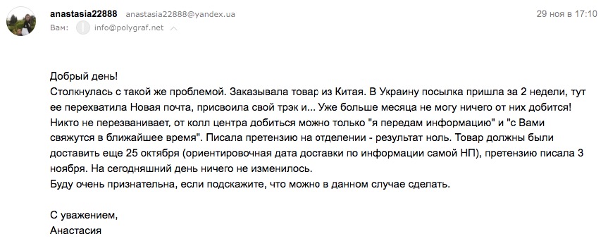 Мы предполагаем, что незаконное посредничество "Новой Пошты" в цепочке Китай (отправитель) - Получатель происходит с согласия таможни. Ведь свой незаконный track номер "НП" присваивает именно на таможенном терминале. Сотрудники таможни знают, что это мошеничество в чистом виде. Всему виной наша банальная коррупция. В начале декабря мы написали запрос на Главное управление ДФС в г. Киеве, однако ответа от них так и не получили.