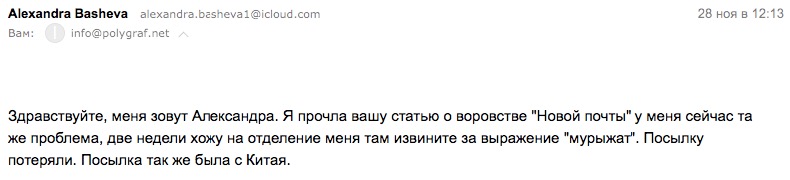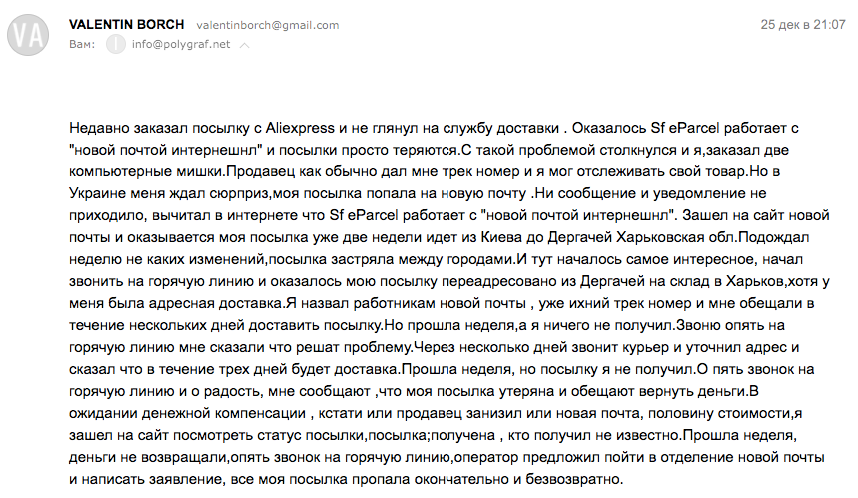 Они попытались разъяснить ситуацию с доставкой грузов из Китая в Украину - якобы все хорошо и красиво, и проблем у нас нет. Однако, письма и комментарии наших читателей, доказывают обратное. Проблемы с кражей и доставкой есть и они на самом деле намного больше чем могут себе представить руководители "Новой Пошты". Настоятельно советуем им принять меры, иначе их бизнесу скоро придет конец. Ведь в Украине в сфере экспресс доставок существует огромный выбор все различных компаний, которые учтя ошибки "Новой Пошты" сделают выводы, и переманят к себе клиентов.