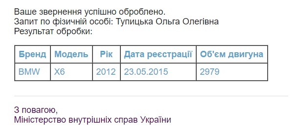 Дружині Тупицького, Ольгі Олегівні, належить баварський кросовер BMW X6 2012 року випуску. Сьогодні дана модель авто 2012р.в. коштує не менше 40.000$ або більше 1млн.грн. Саме ці зазначені в декларації дані і підтвердив Єдиний державний реєстр МВС.