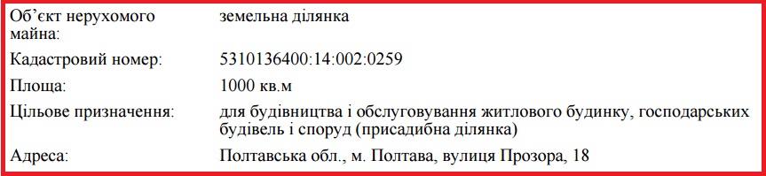Самому ж Олександру Володимировичу належить ще одна земельна ділянка площею 1000м², що теж знаходиться в Полтаві та ділянка 27м², місце знаходження якої невідомо.