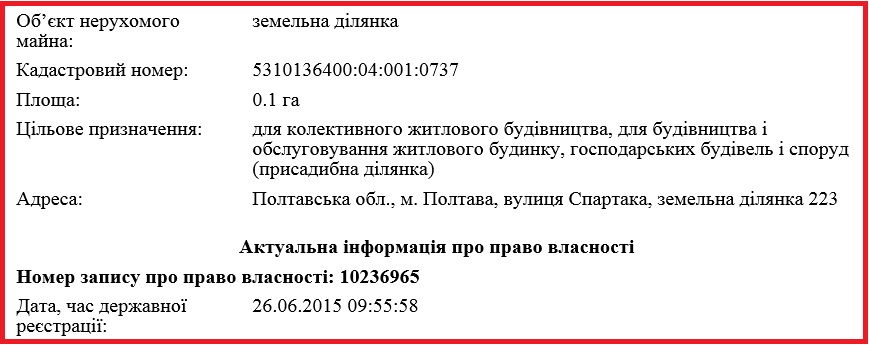 Остання дісталася їй та ще 53 «обраним» в мікрорайоні «Лазурний» від Полтавської міськради п’ятого скликання. За земельні ділянки, ринкова вартість яких, за оцінкою експертів, становить близько 20.000$за 1 ділянку, держава отримала 0 грн.