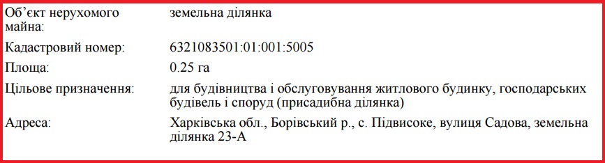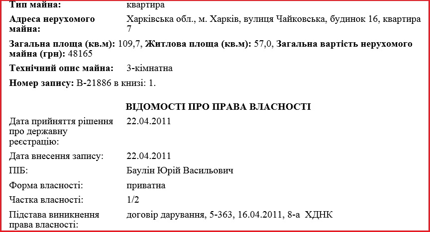 Проте, в Державному реєстрі, інформацію про дану нерухомість ми не знайшли. Зате дізналися, що у спільній власності судді та його дружини, Галини Йосипівни, знаходиться 3-кімнатна квартира у Харкові площею 109,7м².