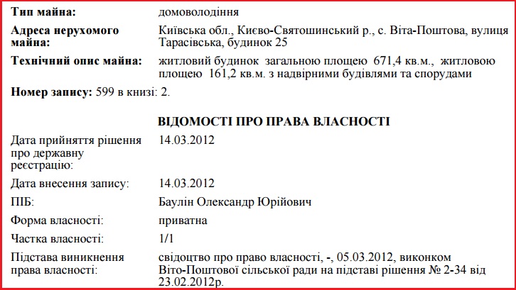До речі, повному тезці сина Бауліна, Олександру Юрійовичу, належить величезний будинок під Києвом, площею 671,4м². Щоправда, будинок не добудований, але масштаби вже зараз вражають. На жаль, підтвердити цю інформацію ми не можемо, проте і спростувати також.