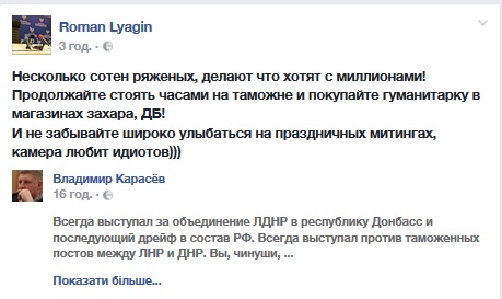 «Вам бабла мало? Надо доить своих еще на пересечении мифической границы внутри Донбасса? Машины стоят по нескольку часов!!! Внутри Донбасса – несколько часов!», – написал он и добавил, что по-прежнему является сторонником присоединения Донбасса к России.