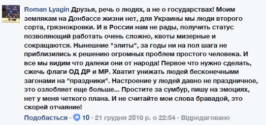 Ранее Лягин выступил против таких движений как «Донецкая республика» и «Молодая республика», заявив, что надо сжечь их флаги.