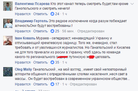 Были и менее корректные комментарии, что, в общем, не умаляет их попадания в точку: "Мураев - сепедераст, ненавидящий Украину и отлизывающий кремлевскую задницу. Того же, очевидно, стал требовать и от уволившихся журналистов. Но Ганапольский и Киселев не для того приехали из России в Украину, чтоб здесь по команде какого-то регианального п…а путинскую ж…у целовать".