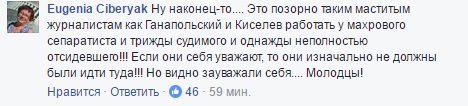 "Ну наконец-то.... Это позорно таким маститым журналистам как Ганапольский и Киселев работать у махрового сепаратиста и трижды судимого и однажды неполностью отсидевшего!", - пишет Eugenia Ciberyak.