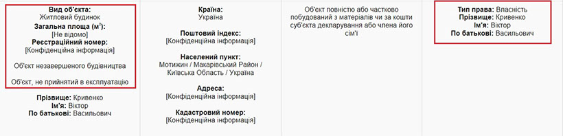 Також, пану Кривенку належить будинок 81кв.м., ½ квартири площею 151,9кв.м., ½ гаража площею 20,40кв.м. та недобудова в с. Мотижин, Київської області.
