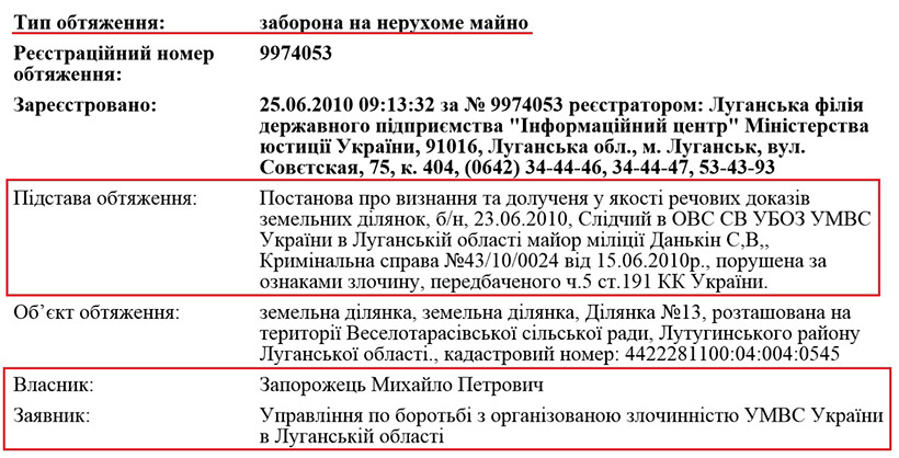Низку питань викликає майно судді. Так, за даними Реєстру прав на нерухоме майно, судді Запорожцю належать 2 земельні ділянки площею 9.711 та 9.712кв.м., що знаходяться на території Веселотарасівської с/р в Луганській області. На ці ділянки ще у 2010р. Управлінням по боротьбі з організованою злочинністю УМВС України в Луганській області, накладено заборону. Їх було визнано та долучено у якості речових доказів у Кримінальній справі №43/10/0024 від 15.06.2010р., що порушена за ознаками злочину, передбаченого ч.5 ст.191 КК України, а саме: привласнення, розтрата майна або заволодіння ним шляхом зловживання службовим становищем в особливо великих розмірах або організованою групою, - караються позбавленням волі на строк від семи до дванадцяти років з позбавленням права обіймати певні посади чи займатися певною діяльністю на строк до трьох років та з конфіскацією майна.