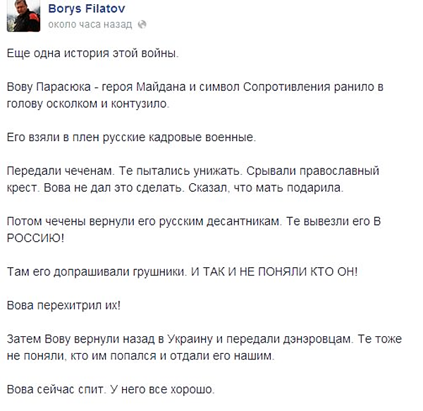 Последний отжиг Парасюка, кстати, живописно описал в Facebook сам Борис Филатов, подаривший украинским школярам на 1 сентября увлекательнейшую одиссею про то, как «Вова Парасюк - герой Майдана и символ Сопротивления», весь израненный и контуженый, хитростью вышел из плена, обманув диких чеченцев, тупых ополченцев и даже крутых перцев из ГРУ.