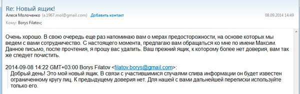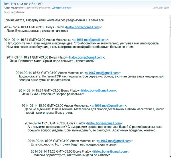 Вне сомнения, заслуживающей отдельного внимания и более детального изучения темой также является «Облако» - совместно планируемая украинскими спецслужбами и людьми Коломойского провокация, которая может переплюнуть даже историю с «Боингом» (что-то связанное с использованием радиоактивных материалов), намеченная на конец сентября (к ней неоднократно возвращались в переписке Филатов и «Алеся-Максим»).