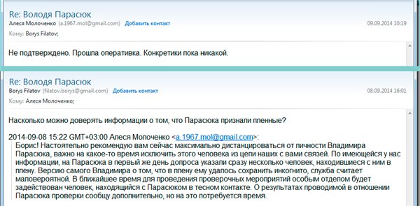 «Борис! Настоятельно рекомендую вам сейчас максимально дистанцироваться от личности Владимира Парасюка, важно на какое-то время исключить этого человека из цепи наших с вами связей. По имеющейся у нас информации, на Парасюка в первый же день допроса указали сразу несколько человек, находившиеся с ним в плену. Версию самого Владимира о том, что в плену ему удалось сохранить инкогнито, служба считает маловероятной. В ближайшее время для проведения проверочных мероприятий особым отделом будет задействован человек, находящийся с Парасюком в тесном контакте. О результатах проводимой в отношении Парасюка проверки сообщу дополнительно, но на это потребуется время», - сообщает «Алеся-Максим».