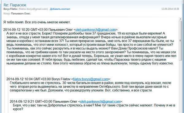 Даже подробности тайного захоронения мирных жителей, недавно обнаруженного в окрестностях Донецка после отступления оттуда украинских военных, меркнут на фоне бойни, о которой стало известно только благодаря взломанной хакерами электронной почте заместителя главы Днепропетровской ОГА Бориса Филатова.