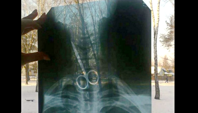 К врачам Черниговской областной больницы обратился местный житель с просьбой осмотреть его. Медики сделали рентген, который показал, что в желудке пациента находятся металлические предметы - ножницы и ложка.