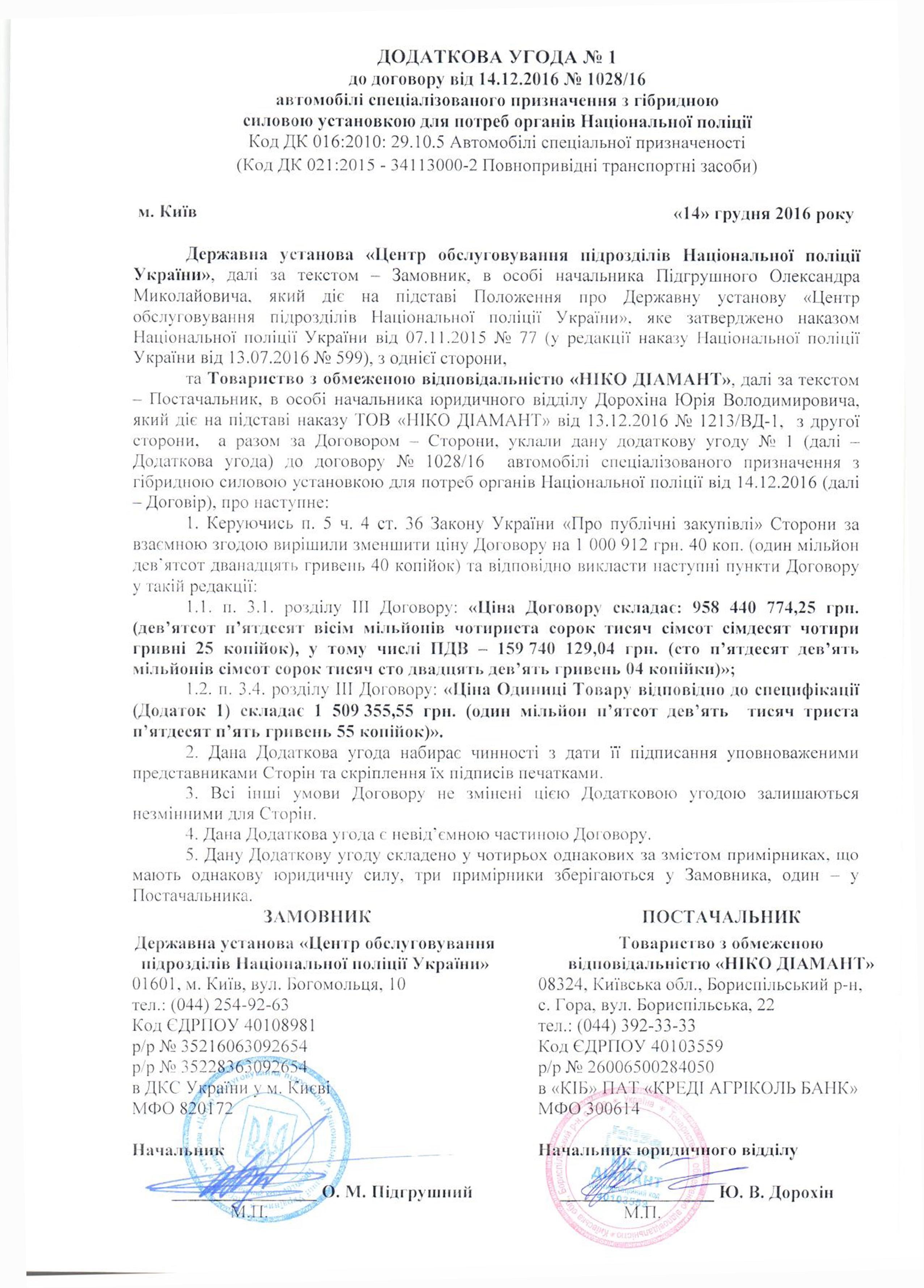 После бури возмущения в СМИ и социальных сетях Нацполиции пришлось немного уменьшить цену закупки. Об этом стороны подписали дополнительное соглашение № 1 к договору – в тот же день, когда подписан основной договор. "Страна" публикует скан этого дополнительного соглашения: