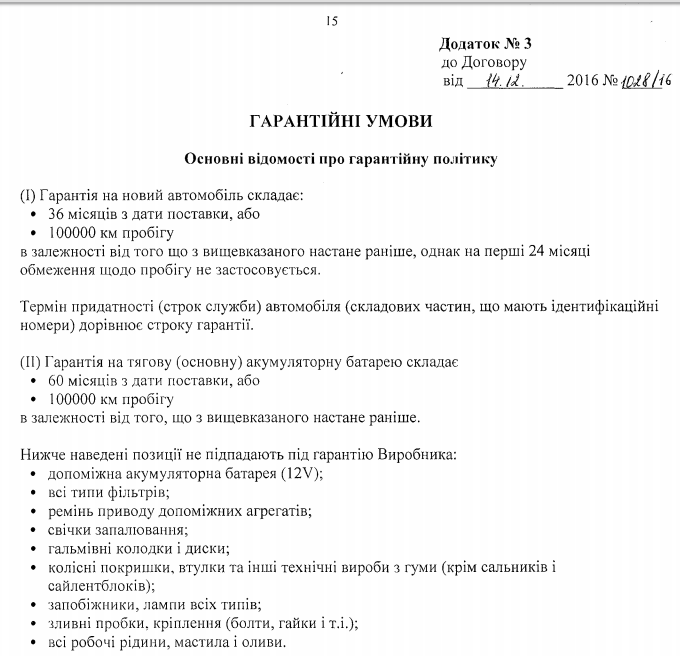 Очень дискриминационными по отношению к покупателю оказались гарантийные условия в приложении № 3 к договору. Там отдельно прописана гарантия на автомобиль, и отдельно – на тяговую аккумуляторную батарею. На нее гарантия – 5 лет или 100 тысяч километров пробега – в зависимости от того, что случится раньше: