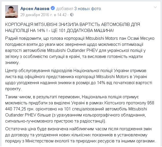 Интересно, что на следующий день после того, как деньги были уплачены, министр внутренних дел Арсен Аваков разразился на своей странице в Фейсбуке градом обещаний насчет того, что президент корпорации Mitsubishi Motors якобы согласился предоставить скидку в размере 14 %: