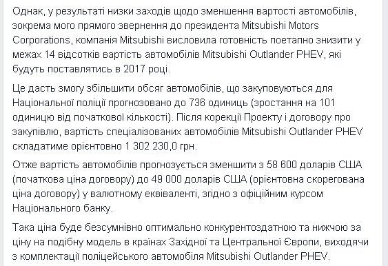 По словам министра, "это позволит увеличить объем автомобилей, закупаемых для Национальной полиции прогнозируемо до 736 единиц (рост на 101 единицу от исходного количества). После коррекции Проекта и договора о закупке, стоимость специализированных автомобилей Mitsubishi Outlander PHEV составит ориентировочно 1302 230,0 грн.":