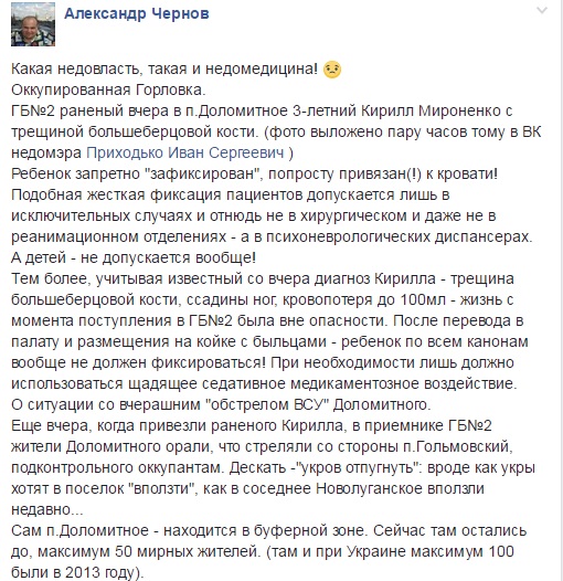 Он разместил фото 3-летнего Кирилла Мироненко, раненного в п. Доломитное неподалеку от оккупированной Горловки.