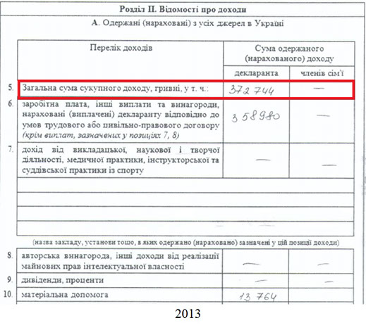 У деклараціях за 2014 та 2015 роки немає ні мільйонних грошових подарунків, ні подарованих квартир в центрі міста, як у його родичів. Лише заробітна плата його та дружини та дві квартири в Києві. Згідно декларації одна з них належить дружині, інша – самому судді.