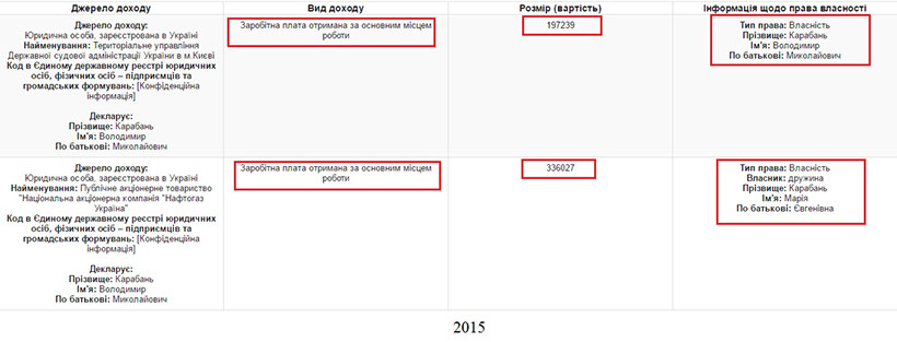 Аналізуючи декларації судді Карабаня та його дружини за 2013, 2014 та 2015 роки, цікаво зауважити, що дружина судді Карабаня почала декларувати суддівську заробітну плату лише в 2014 році, тоді вона склала трохи більше 3 тис. грн за рік.