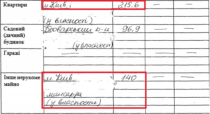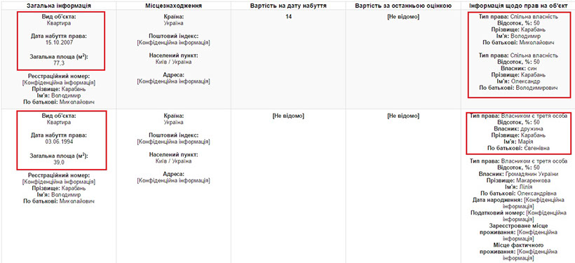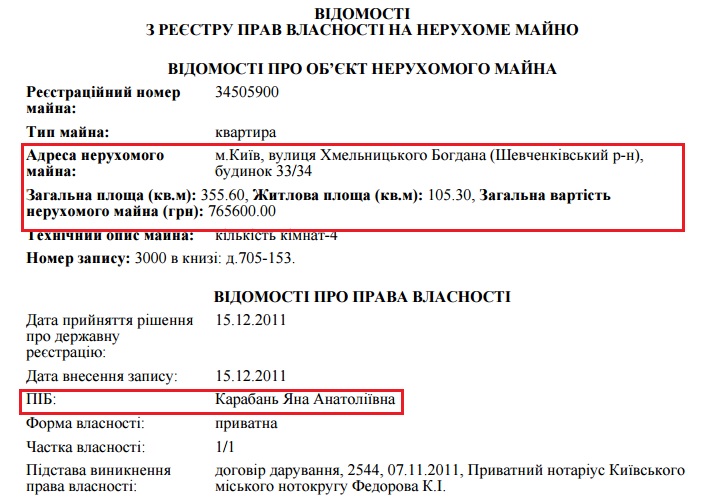 Відповідно до інформації з Реєстру право власності на кватиру виникло у Яни Анатоліївни 15.12.2011. Однак у деклараціях за 2014 та 2013 р. ми не знайшли такої квартири. В минулих деклараціях Яна Карабань вказувала, що є власником квартири площею 215, 6 м2 та мансарди 140 м2. , тобто двох самостійних об’єктів нерухомості. Таку ж інформацію у своїх деклараціях за 2013 та 2014 р. і її чоловік.