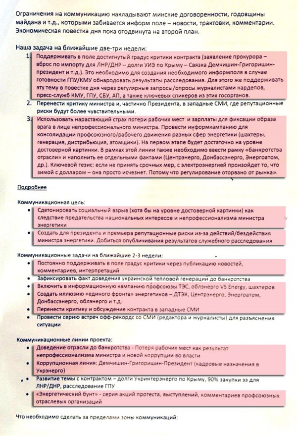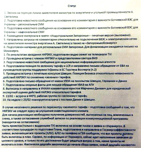 Документ состоит из четырех Модулей, описывающих стратегию по защите интересов ДТЭК и тактические шаги в период с января по май текущего года. Дедлайны некоторых мероприятий, приведенных в документе, запланированы на июль-август. Между тем, большая часть мероприятий уже должны быть выполнены.