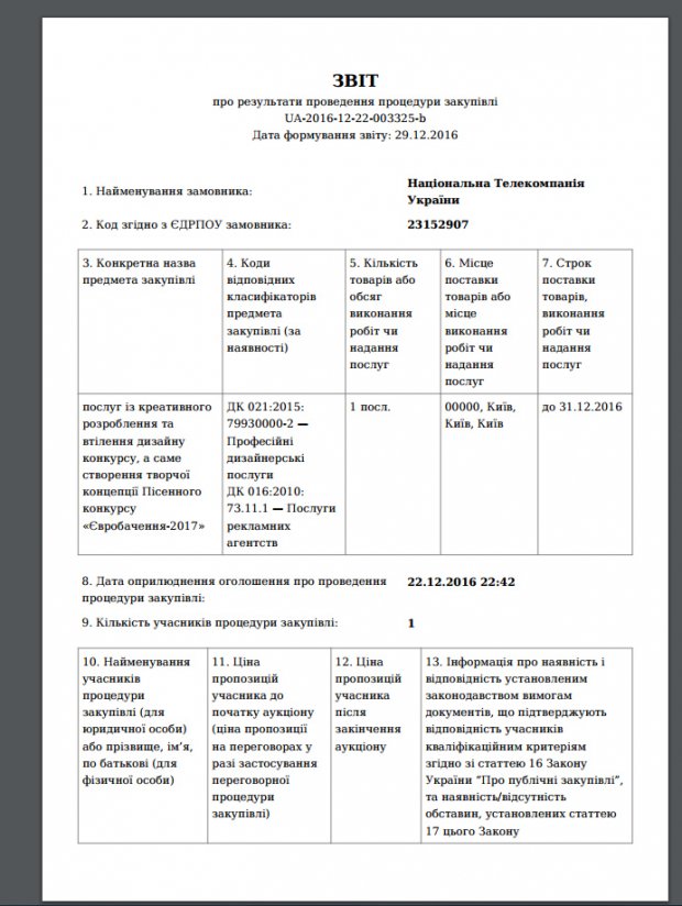 Оголошення про проведення процедури закупівлі оприлюднили 22 грудня 2016 року о 22:42. А вже о 22:43 того ж дня стало відомо про намір укласти договір.