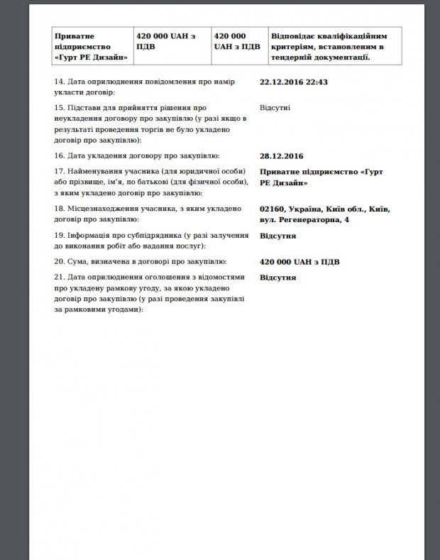 З документу, опублікованого на сайті системи Рrozorro стало відомо, що на тендер було виставлено лише одну роботу компанії "Гурт РЕ Дизайн".