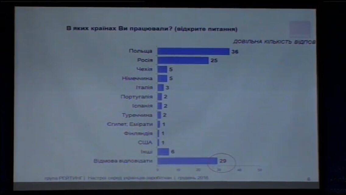 Куда же ездили наши украинцы для работы за границей. «Так, 30% или каждый третий побоялся рассказать, куда он ездил на заработки, не «захотели раскрывать карты», - подчеркнул социолог. При этом - 36% сказали, что были на заработках в Польше, 25% - в Росси, 5% - в Чехии, 5% - в Германии, 3% - в Италии, 2% - в Португалии, Испании, Турции, 1% - в Египете, ОАЭ, Финляндии и незначительное количество в США или других странах.