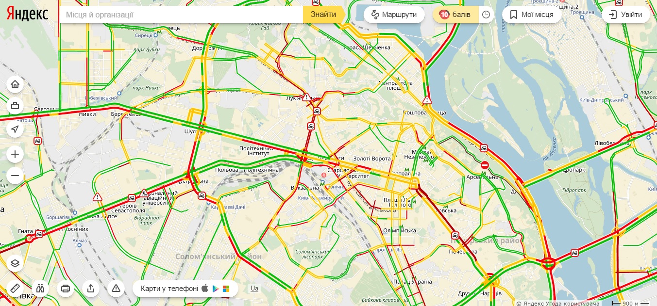 В центре также заторы, стоят, в частности, улицы Тарасовская, Саксаганского, Толстого, Жилянская, Владимирская, Хмельницкого, Михайловская, Крещатик, проспект Победы, Владимирский спуск, Черновола, Рыбалко и вся Лукьяновка.