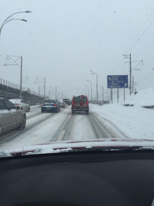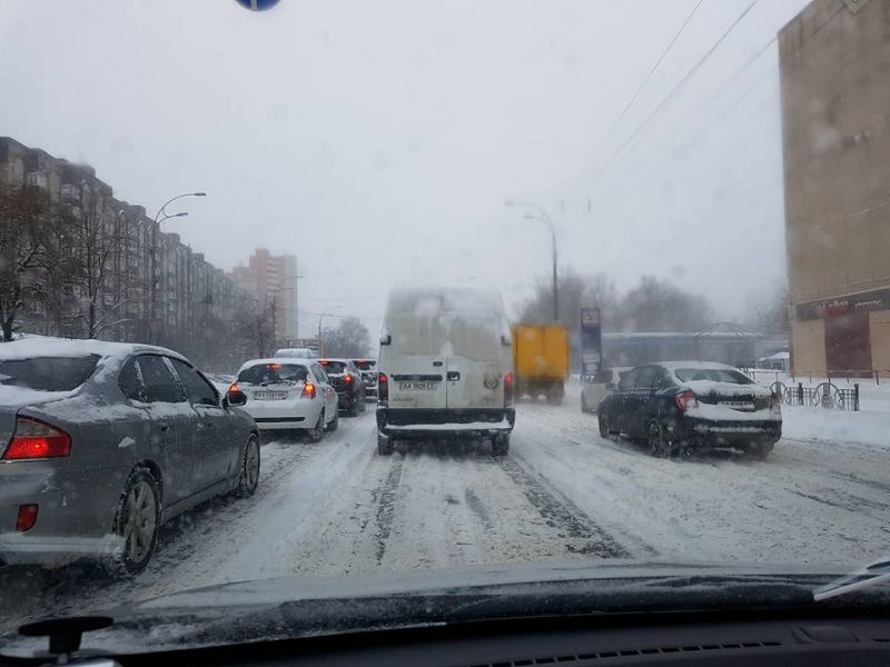 В Києві черговий транспортний колапс через снігопад. Жодної техніки, яка б чистила ключові транспортні артерії, не спостерігається... намагаюсь вже більше години добратися до роботи...