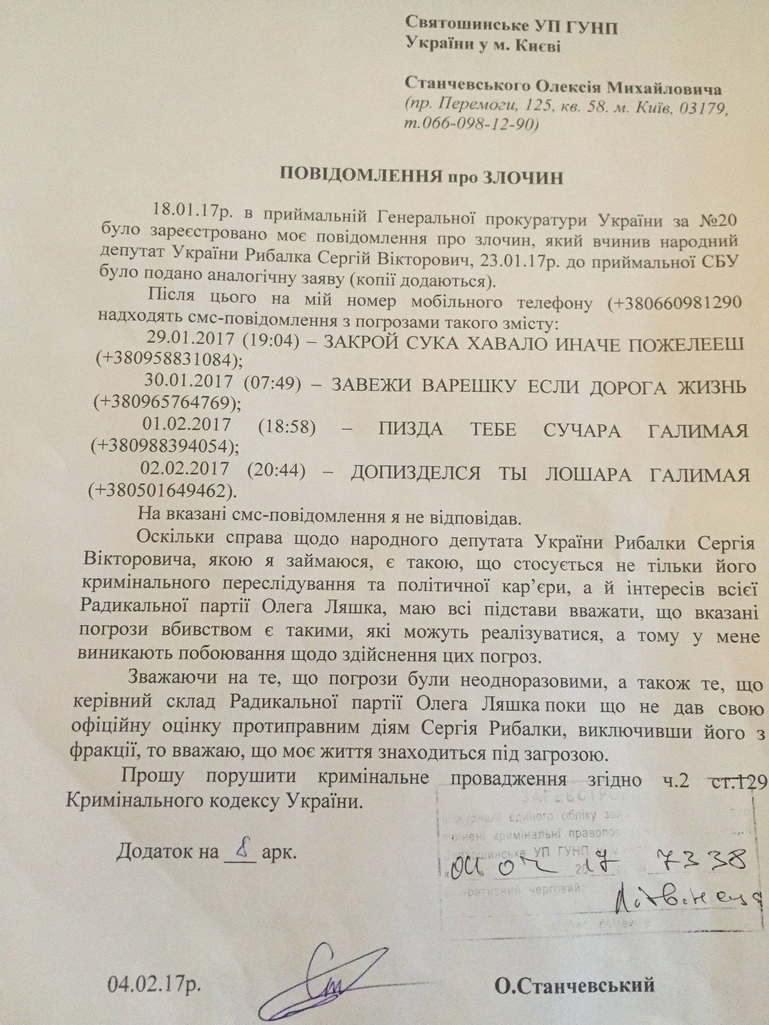 «Зважаючи на те, що погрози були неодноразовими, а також те, що керівний склад Радикальної партії Олега Ляшка поки що не дав свою офіційну оцінку протиправним діям Сергія Рибалки, виключивши його з фракції, то вважаю, що моє життя знаходиться під загрозою», - написав у зверненні до Національної поліції Олексій Станчевський.