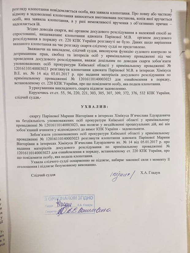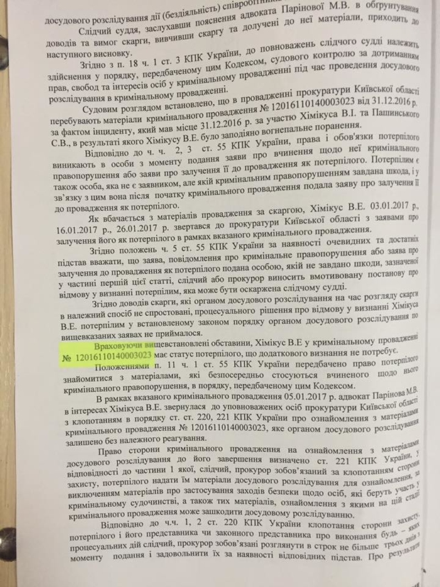 "Суд констатировал, что Вячеслав Химикус имеет статус потерпевшего. Это и стало основанием для удовлетворения нашей жалобы относительно ознакомления с материалами досудебного расследования", – написала адвокат.