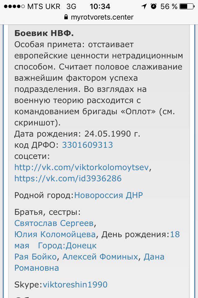 «Цим фактом зацікавився аналітичний відділ ГІ «Права Справа». І не даремно, адже перевірка інформації дала дуже несподіваний результат. Ця «спецоперація» має дуже цікаву передісторію. Напередодні в лавах 5-ї стрілецької мотопіхотної бригади «Оплот» засікли двох бійців нетрадиційної сексуальної орієнтації. Під час любощів застукали Віктора Коломойцева та Едуарда Полиннікова. Оскільки російська пропаганда не має меж цинізму, саме Віктора Коломойцева, уродженця Донецька, і намагаються видати за «майора ЗСУ», - сказав Дмитро Снєгирьов.