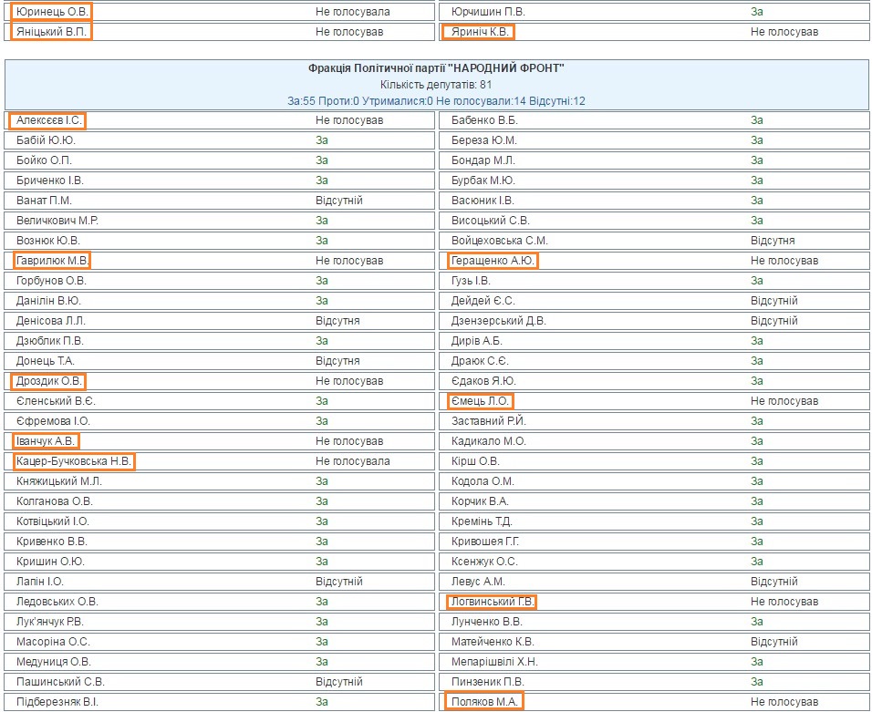 Фракция политической партии "НАРОДНЫЙ ФРОНТ" Количество депутатов - 81, отсутствуют - 12 (14,8%);