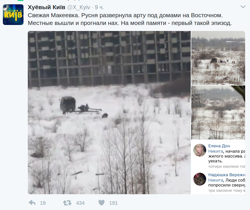 В соцсетях оживленно обсуждают как жители микрорайона Восточный в Макеевке прогоняли российских артиллеристов, приехавших пострелять в 100 метрах от жилых высоток и в 300 метрах от детсада и больницы. Вышли и прогнали - гаубица уехала.