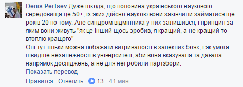 "Но на днях случился и вовсе апофеоз совковости - Олю вызвали на всеобщее собрание института. И хотя официально собрание было мирное, не чем иным, как публичным судилищем, я назвать это не могу. Люди, чей индекс Хирша (уровень цитируемости) приблизительно 2, утверждали что Оля с ее уровнем 21 - это не так уж и круто, подумаешь. И открытие не такое уж и мирового масштаба, и зачем было и вовсе встречаться с журналистами, попиариться захотела, девочка?.. А к Гройсману зачем ходила? Позвали? Надо не соглашаться!.. Скромнее надо быть! И к чему ты, физик, вообще полезла в сферу химии, а?" - рассказал она.