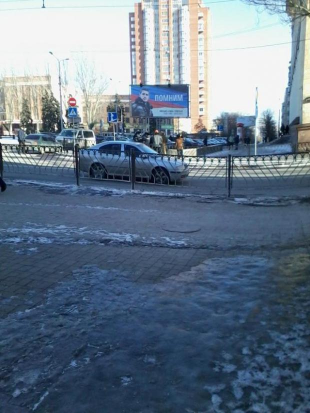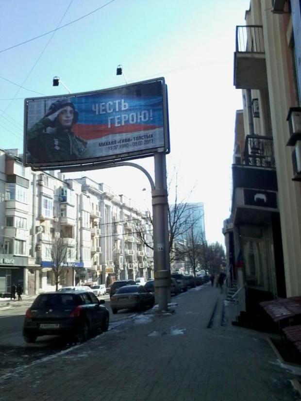 В окупованому Донецьку з’явилися рекламні плакати, які нав’язують містянам скорботу за вбитим в Макіївці (тимчасово окупована територія Донецької області) вчора, 8 лютого, бойовиком Михайлом Толстих на прізвисько «Гіві». Про це пишуть донеччани в соціальних мережах.