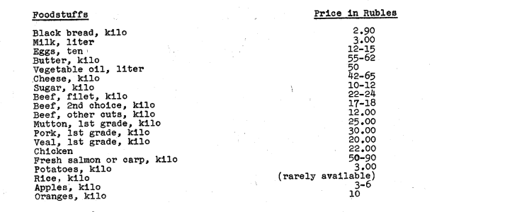 Несмотря на пропаганду развития тяжелой промышленности, весной 1955 года многих на киевских фабриках сократили и немало рабочих направились работать в колхозы. В Киеве ощущается существенное недовольство дефицитом продуктов. Местные жители обеспокоены таким положением вещей и думают, что может быть и хуже. В магазинах выстраиваются длинные очереди за маслом и сахаром".