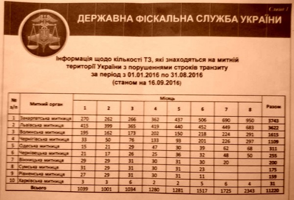 Есть копия одного из документов проверки, где содержится сводная информация о количестве транспортных средств, которые находятся на таможенной территории Украины с нарушением сроков транзита с 1 января по 31 августа 2016 года: