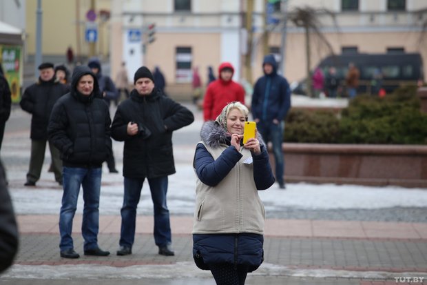 Корреспондент TUT.BY сообщает, что среди собравшихся в том числе и работающие горожане, которые вышли на акцию, чтобы поддержать своих близких и всех, кого коснулся налог.