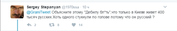 Пользователь Сергей Степанян написал: "Объясните этому "Дебилу б**ть", что только в Киеве живет 400 тыс. русских. Хоть одного стукнули по голове, потому что он русский?"