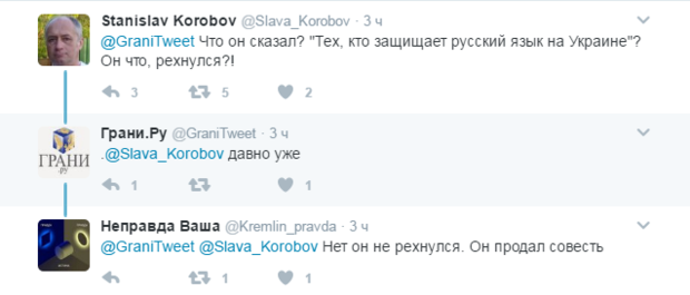 Пользователь Станислав Коробов задал риторический вопрос: "Что он сказал? "Тех, кто защищает русский язык в Украине"? Он что, рехнулся?!"