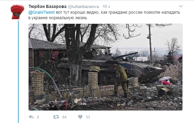Пользователь под ником "Тюрбан Базарова" разместил фотографию разрушенного войной украинского города и прокомментировал:"Вот тут хорошо видно, как граждане России помогли наладить в Украине нормальную жизнь".