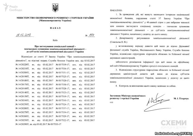 6 февраля Министерство экономического развития и торговли по требованию СБУ издало приказ, согласно которому против 16 компаний — импортеров нефтепродуктов введены специальные санкции — запрет внешнеэкономической деятельности. Причина санкций та же — уголовное производство по статье 285-5 («финансирование терроризма»). На компании, против которых введены санкции, приходится 40% импорта сжиженного газа в 2016 году.